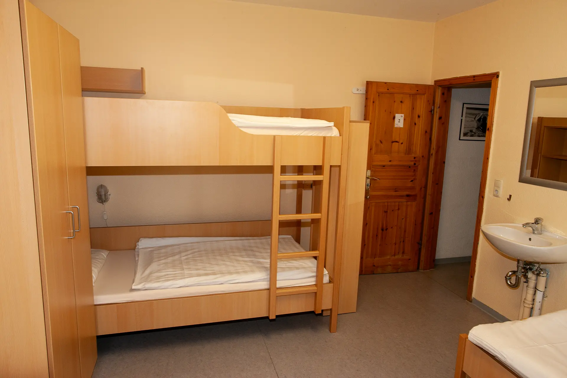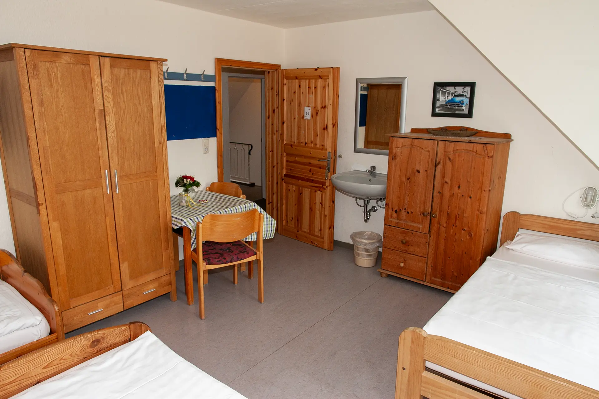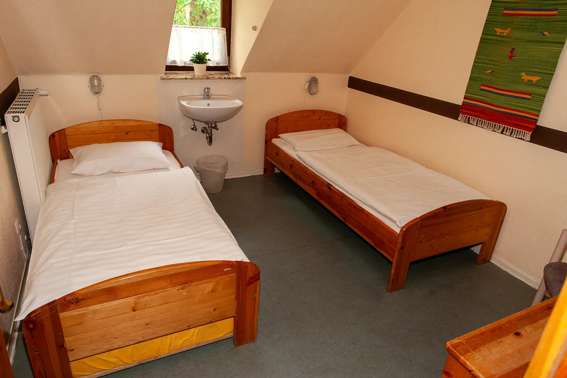 Drei Zimmer befinden sich im Erdgeschoss. Die restlichen zehn Zimmer befinden sich im Obergeschoss. Wir haben Einzel-, Doppel- und Mehrbettzimmer mit bis zu sechs Betten.