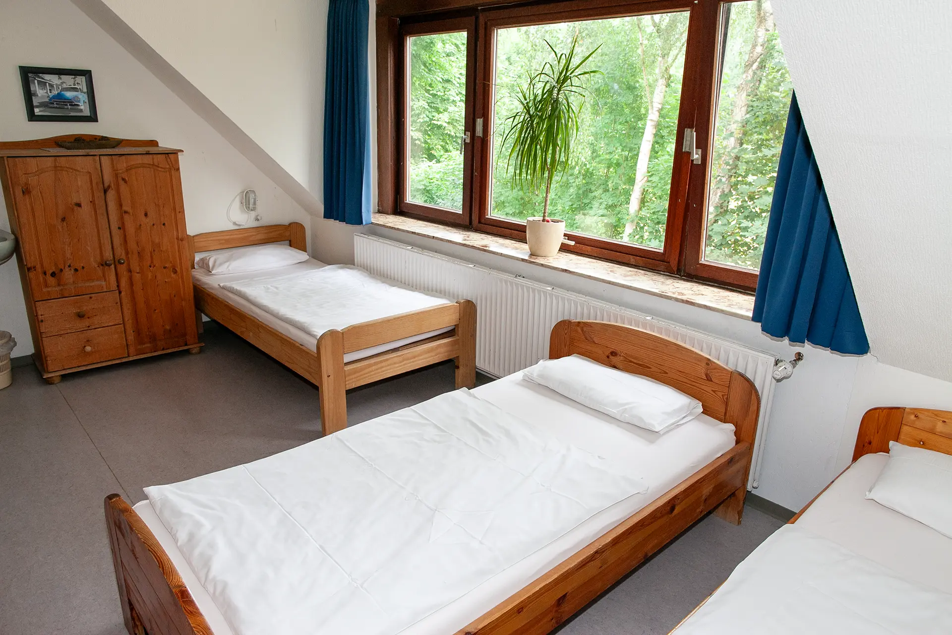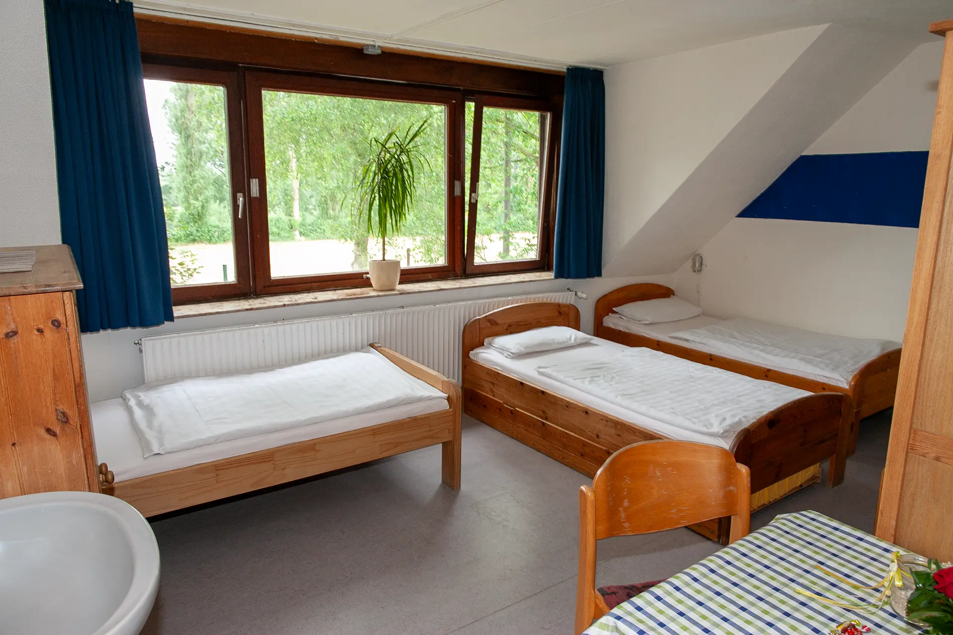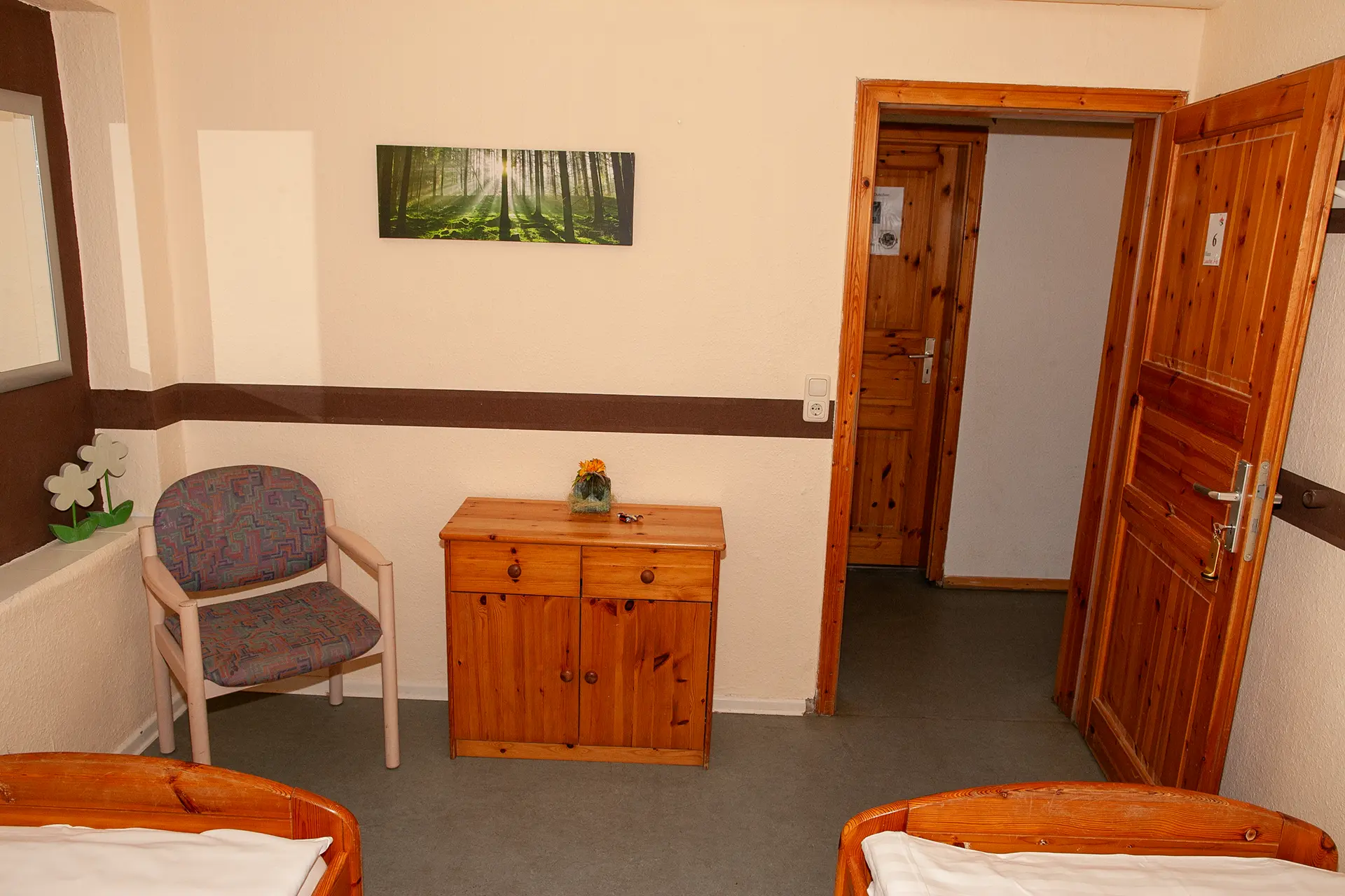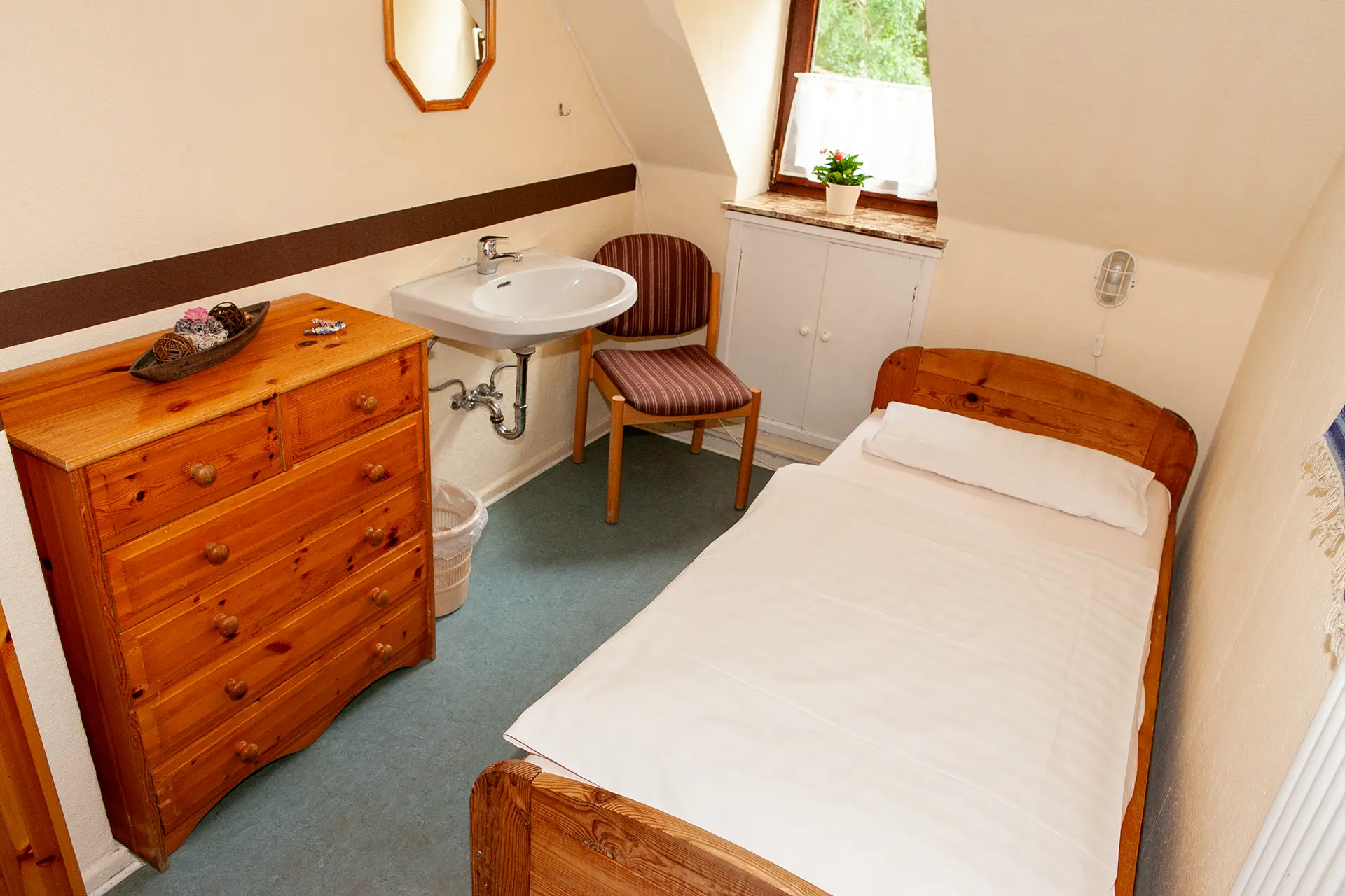 Drei Zimmer befinden sich im Erdgeschoss. Die restlichen zehn Zimmer befinden sich im Obergeschoss. Wir haben Einzel-, Doppel- und Mehrbettzimmer mit bis zu sechs Betten.