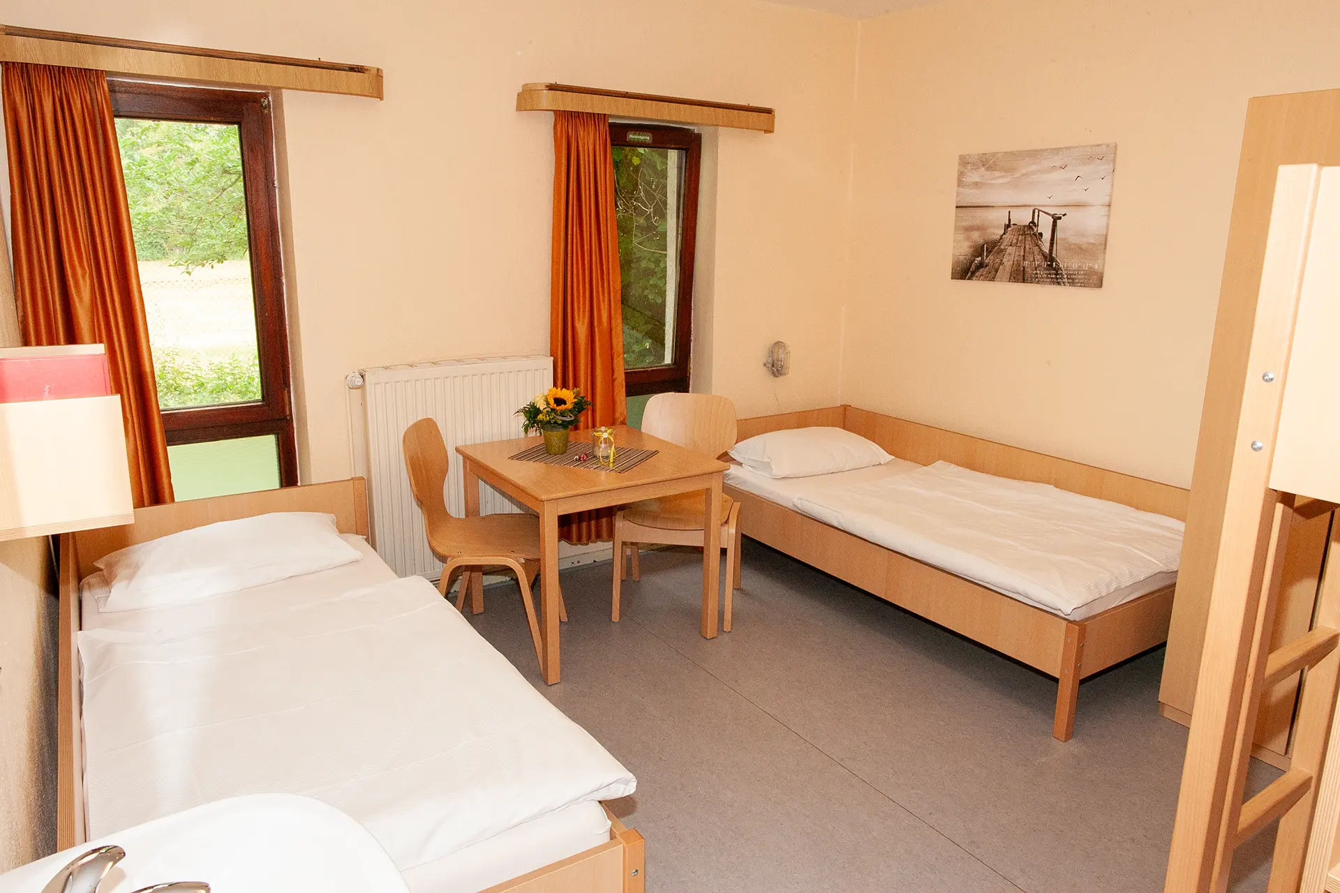 Die Zimmer verfügen zusätzlich über sieben Ausziehbetten, sodass in Ausnahmefällen Gruppen mit bis zu 42 Personen im Haupthaus unterkommen können.